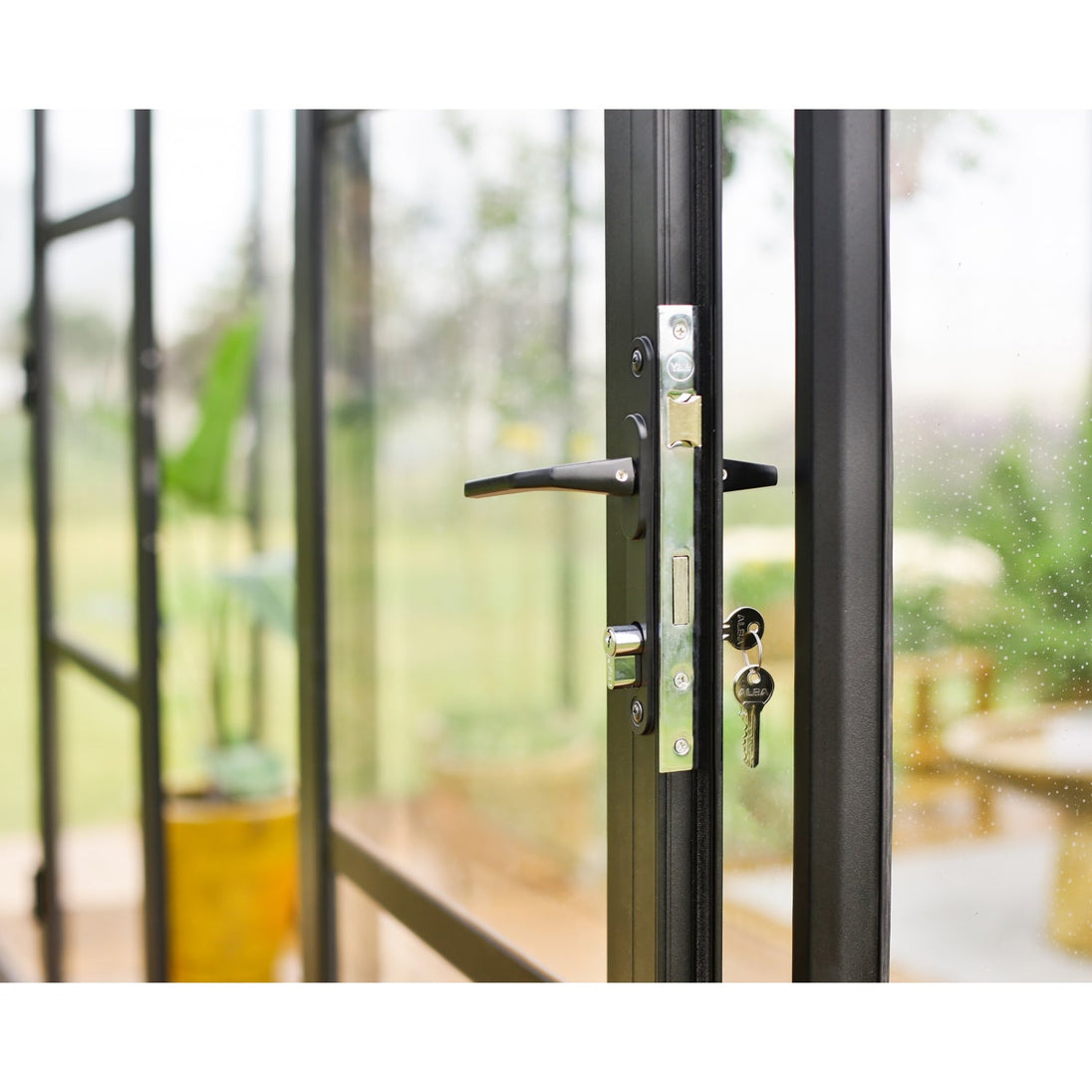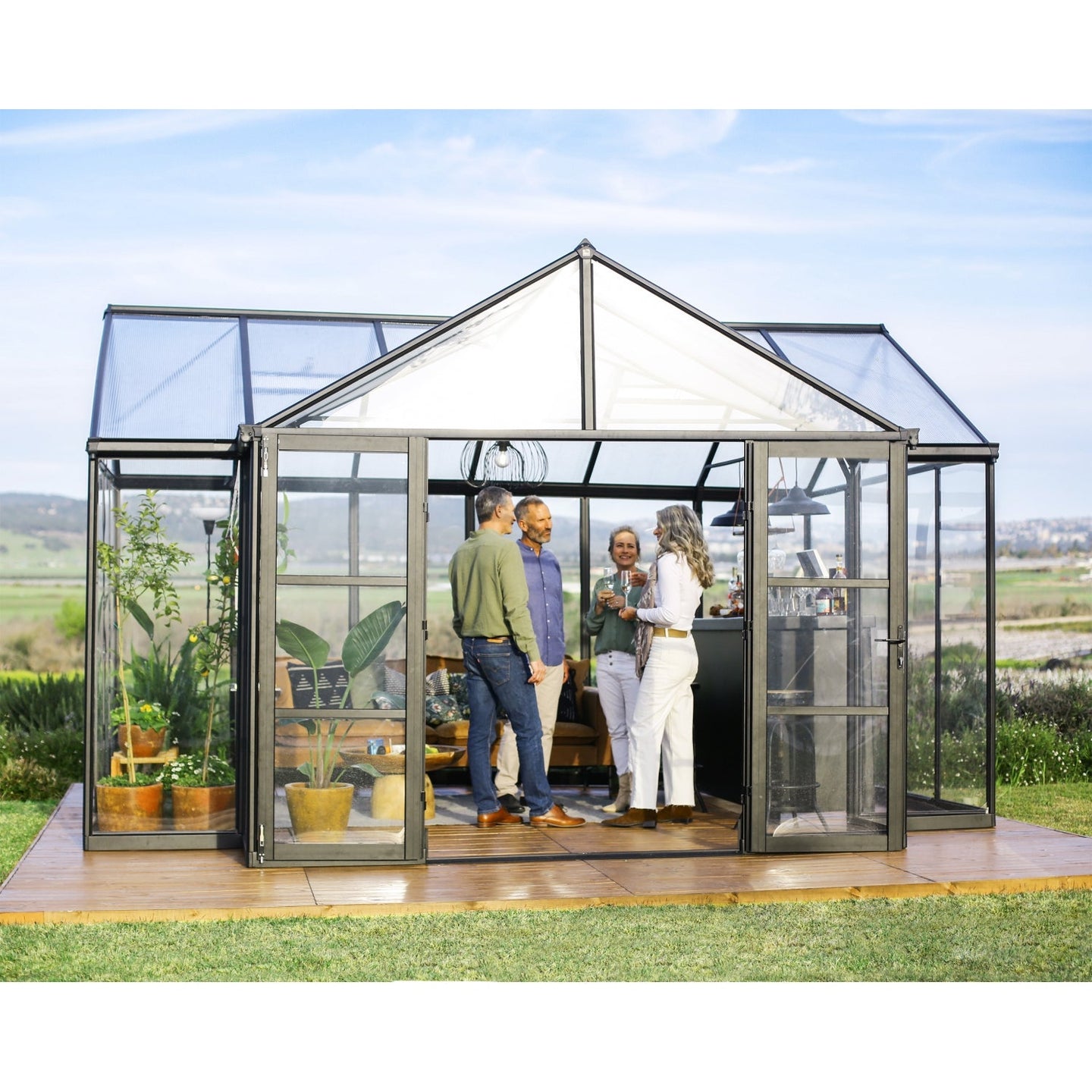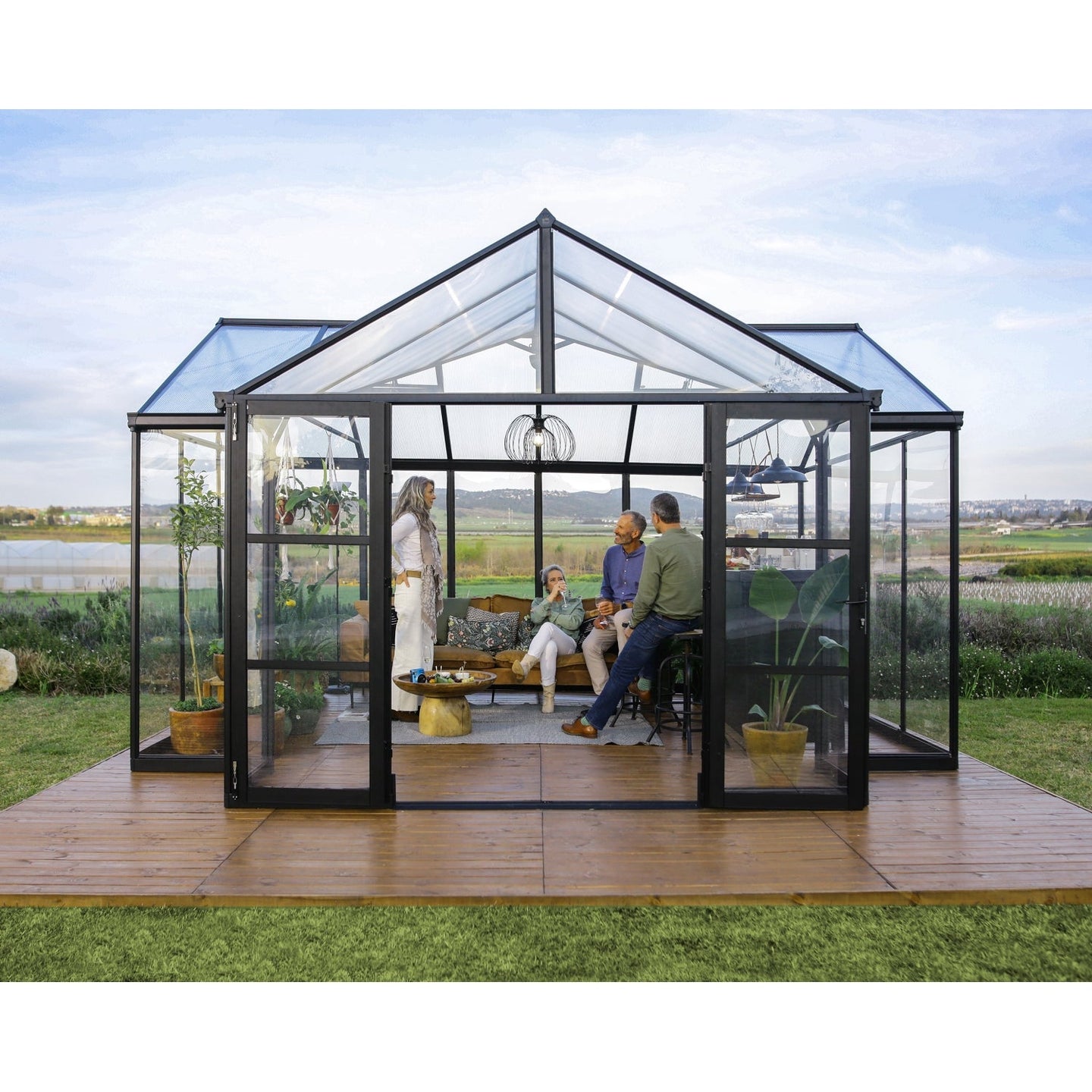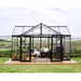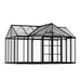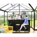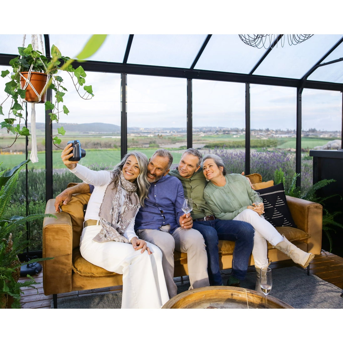 Breathe in the ambience with two large automated roof vents and double swinging doors that easily open and close, providing an abundance of airflow. The solid acrylic glazing reduces outside noise and is exceptionally safe, making a cozy private space for you and your family that you can rely on. The aluminum frame has a fine black finish and is strong enough to hold shelves anywhere inside your greenhouse for plants, decorations, books, or even outdoor dishes. The Triomphe is practically maintenance-free, leaving you to relax, enjoy, and celebrate every day.
