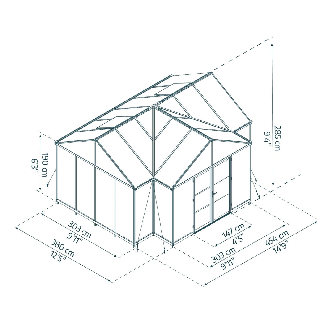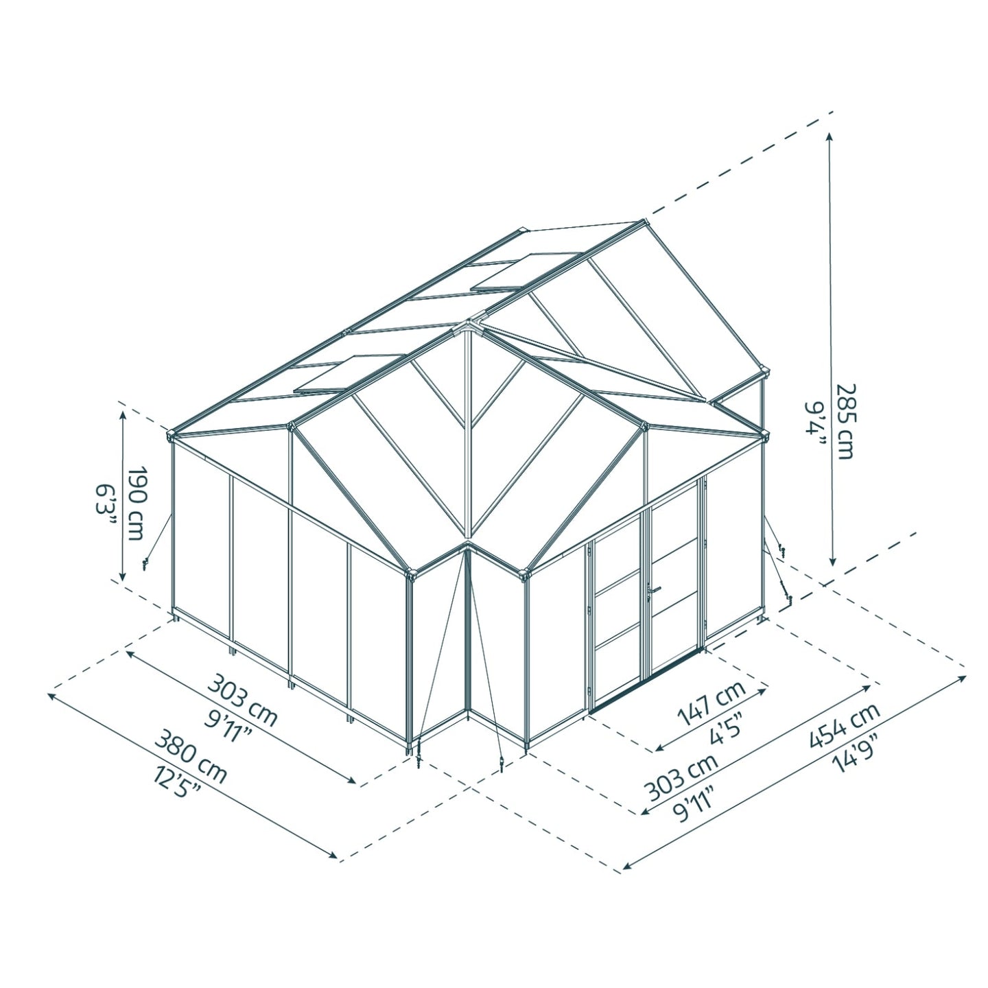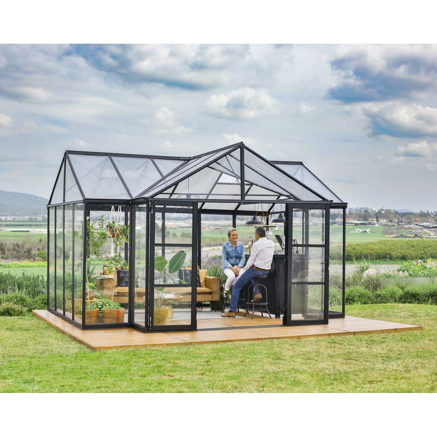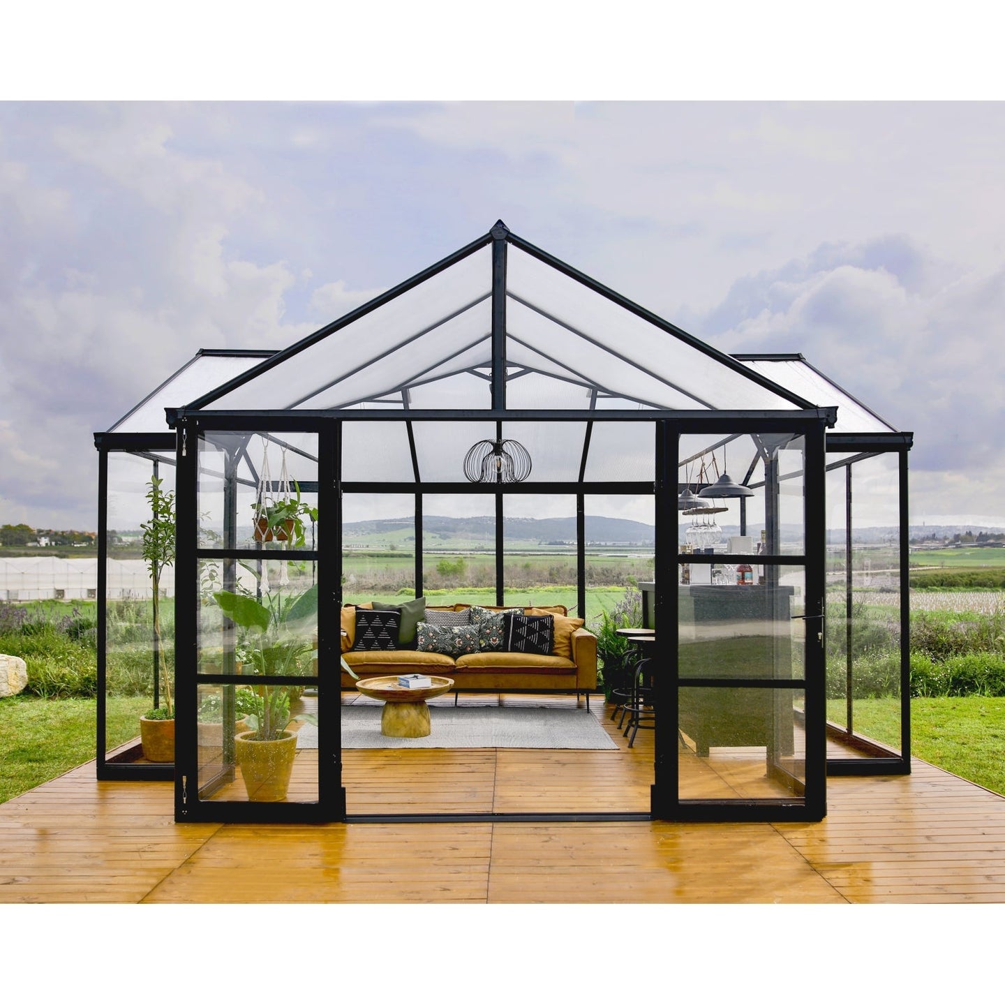 Inspired by the idea of merging garden, home, and outdoor lifestyle, take a second look at your yard as a place to find refuge with the Triomphe Garden Chalet Greenhouse. This robust T-shaped Orangery has high side walls and vaulted ceilings to give you over 9 feet of headroom and a generous layout with enough room to create a truly enjoyable outdoor experience. Large enough for a dining table to share meals with your favorite people or a lounging area filled with comfortable seating for an escape from daily stresses, the Triomphe is meant to extend and elevate your living space. With lighting and heating available to purchase separately, you can create an inviting environment that you want to use all year long.