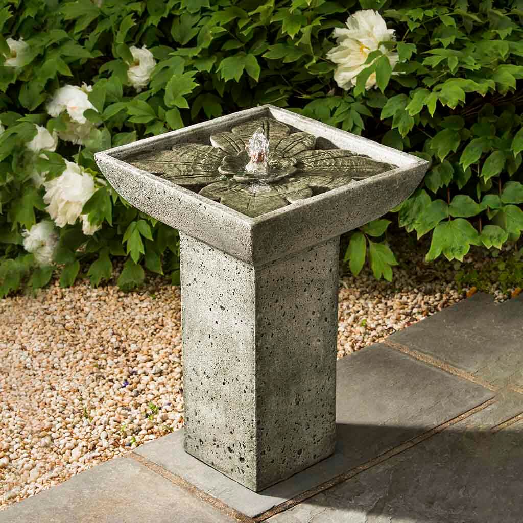 Skilled artisans in the USA handcraft the Andra Fountain. The Campania team applies a unique patina, making each piece one-of-a-kind. This fountain is shown in the Alpine Stone color. Due to materials, manufacturing processes, and variations in photography conditions, natural differences can occur in size, weight, and color. The actual color may vary from the photo.