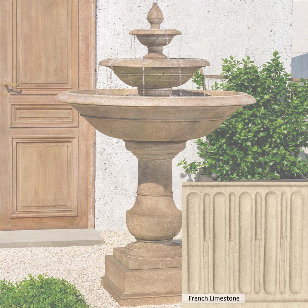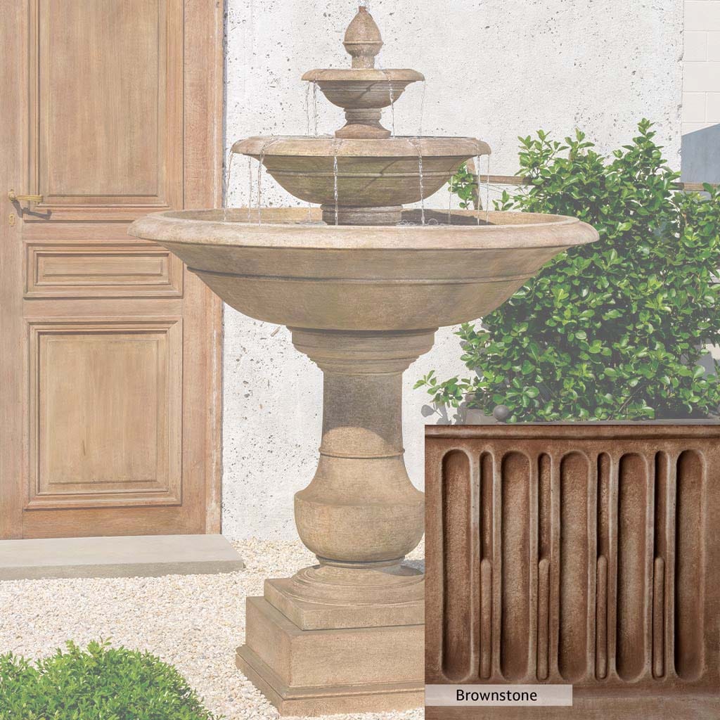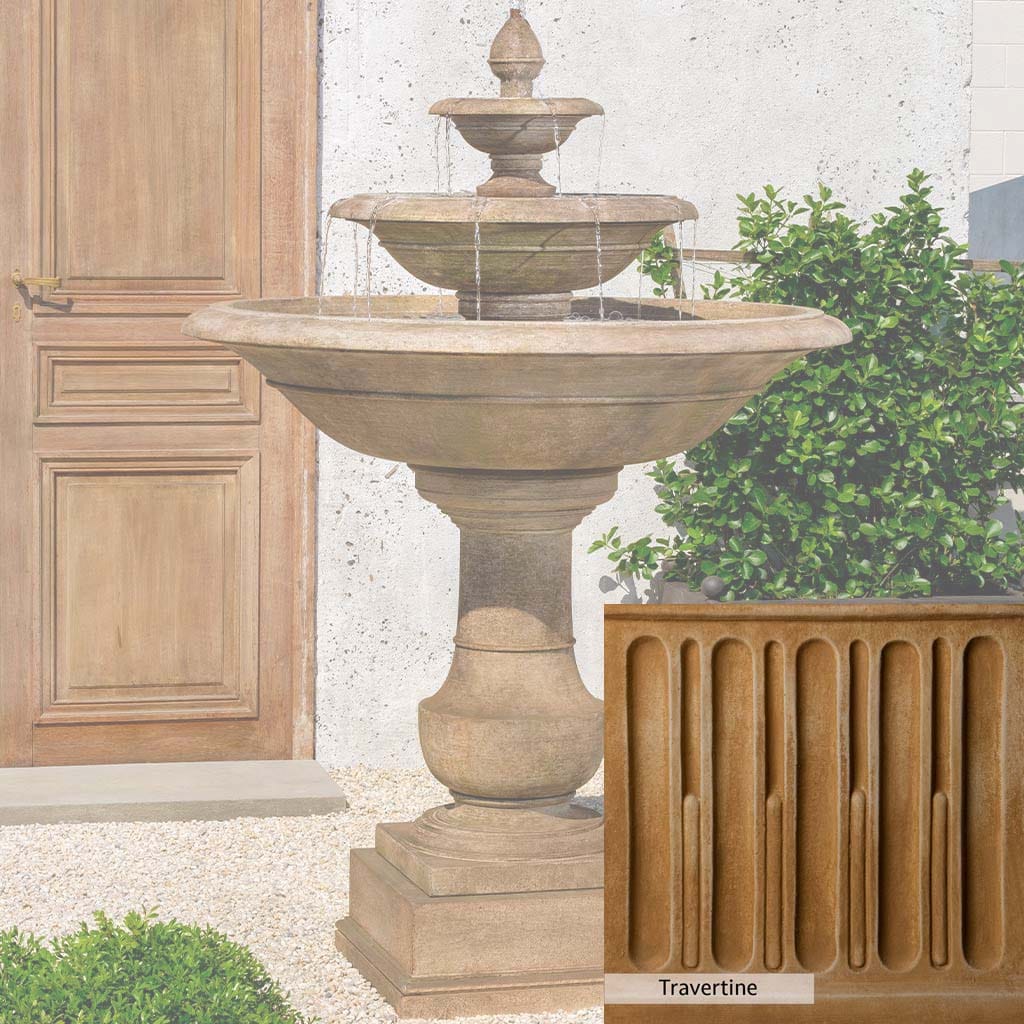 Skilled artisans in the USA handcraft the Savannah Fountain. The Campania team applies the unique patina using their experience, making each piece one-of-a-kind. This fountain is shown in the Travertine color. Campania International's unique cast stone blend is meticulously molded to create each piece used in the construction of this fountain. Due to the materials, manufacturing processes, and variations in photography conditions, natural differences can occur in size, weight, and color. The actual color may vary from the photo.