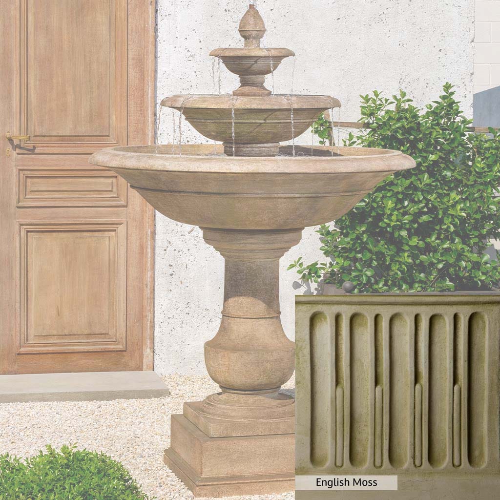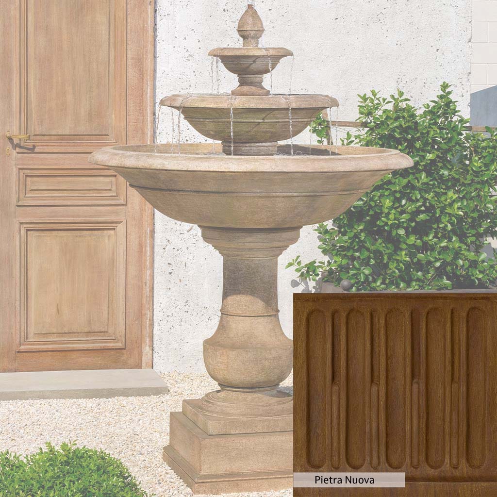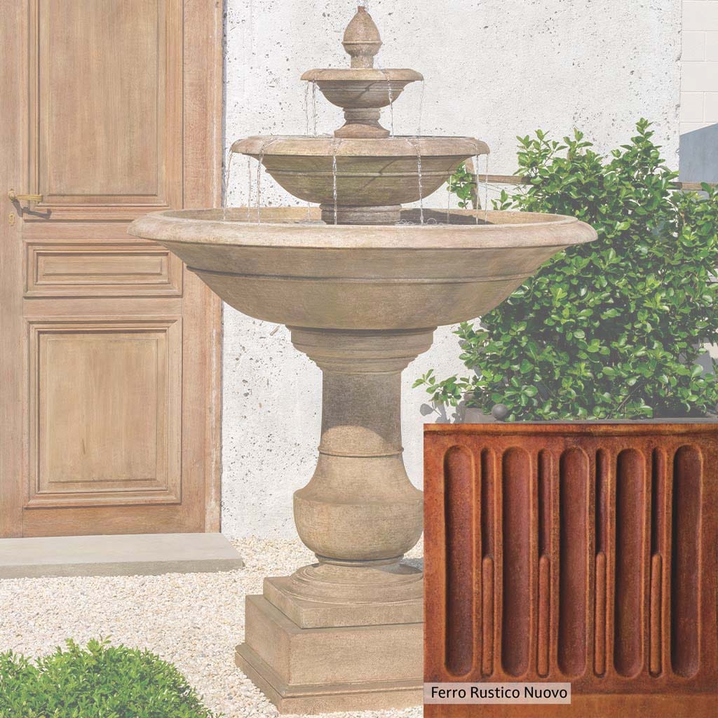 Skilled artisans in the USA handcraft the Savannah Fountain. The Campania team applies the unique patina using their experience, making each piece one-of-a-kind. This fountain is shown in the Travertine color. Campania International's unique cast stone blend is meticulously molded to create each piece used in the construction of this fountain. Due to the materials, manufacturing processes, and variations in photography conditions, natural differences can occur in size, weight, and color. The actual color may vary from the photo.
